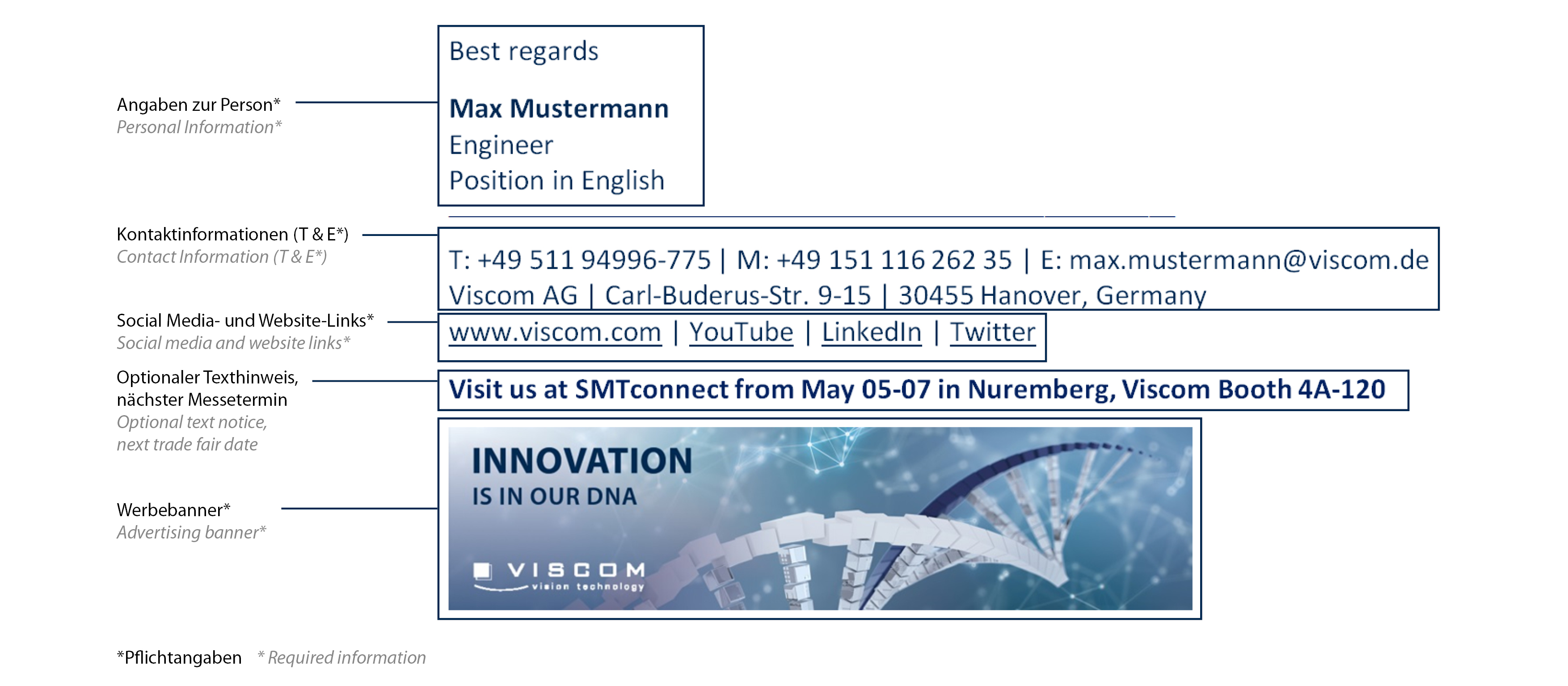 Geschäftliche E-Mails werden als Geschäftsbriefe angesehen, was bedeutet, dass bestimmte formale Vorgaben eingehalten werden müssen. Eine E-Mail-Signatur muss folgende Pflichtangaben enthalten: Firmenname, Rechtsform, Namen der Vorstandsmitglieder, Datenschutzhinweis und wichtige Kontaktinformationen. Darüber hinaus sollte eine gute E-Mail-Signatur auch das Erscheinungsbild des Unternehmens zur Unterstützung des Markenbildes widerspiegeln. Zu diesem Zweck haben wir für alle MitarbeiterInnen von Viscom eine E-Mail-Signatur-Vorlage erstellt, die wie folgt aufgebaut ist: