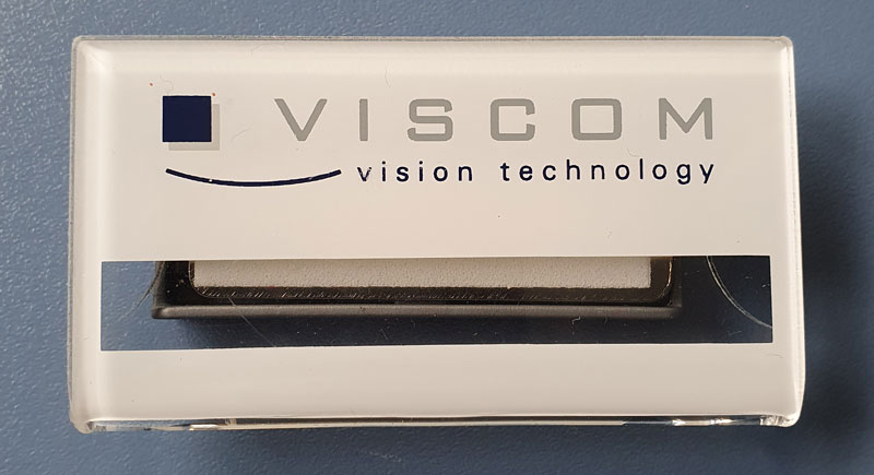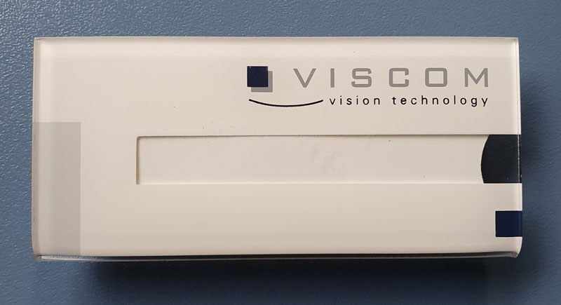 Aufdruck: Viscom Logo, grauer Balken, blaues Quadrat